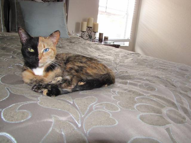eyes on either side. Truly, the cat, whose face on one side is black and